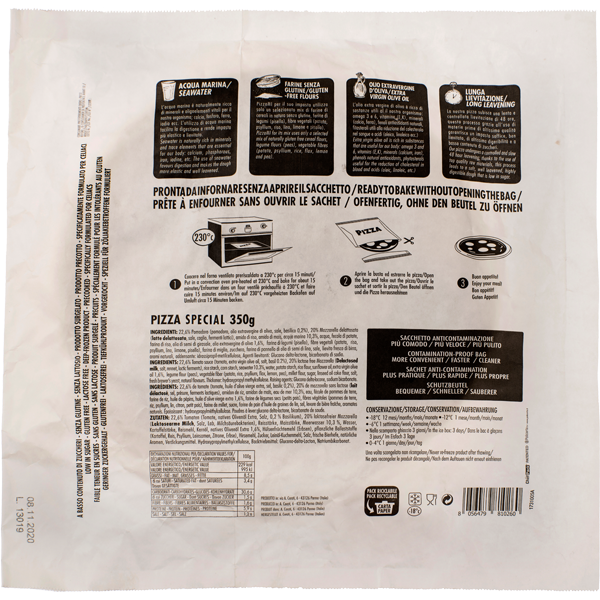 Baking instructions: Preheat the oven to 230°C. Place the product in the oven, as it comes into its special packing (to prevent cross-contamination), for about 15 minutes (no defrosting required).